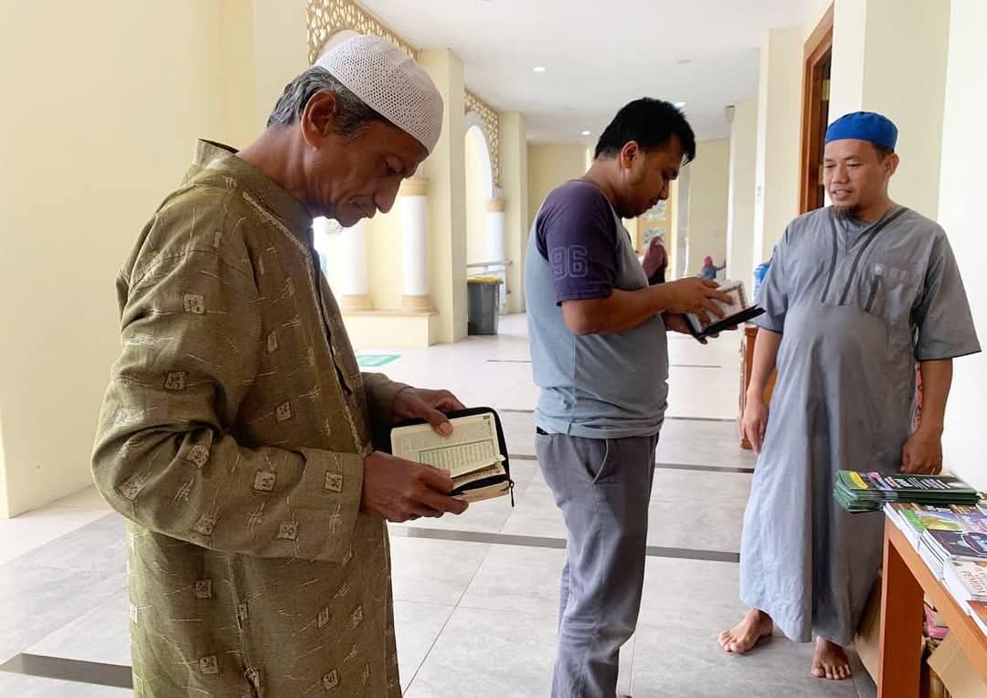 Di salah satu sudut pelataran masjid, Irfan Rifai (39), seorang pedagang keliling buku-buku agama, terlihat sibuk menata barang dagangannya. Sejak pukul 08.30 WIB, ia telah membuka lapak sederhana yang dipenuhi dengan mushaf Al-Qur’an, Kitab Sirah Nabawiyah, Bulughul Maram, dan berbagai buku Islam lainnya.