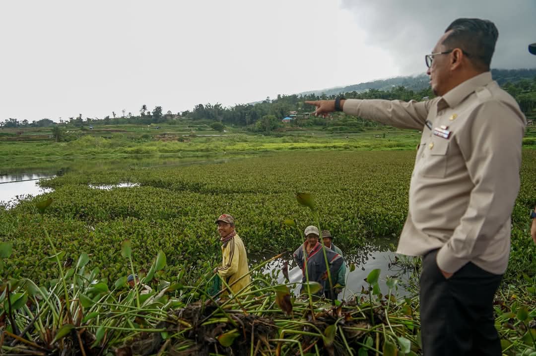 TANAH DATAR, HARIANHALUAN.ID — Bupati Tanah Datar Eka Putra menyerahkan bantuan logistik dan armada secara simbolis kepada Lantamal II Padang yang melaksanakan pembersihan enceng gondok di Talago Koto Baru Kecamatan X Koto, Rabu (22/1).
