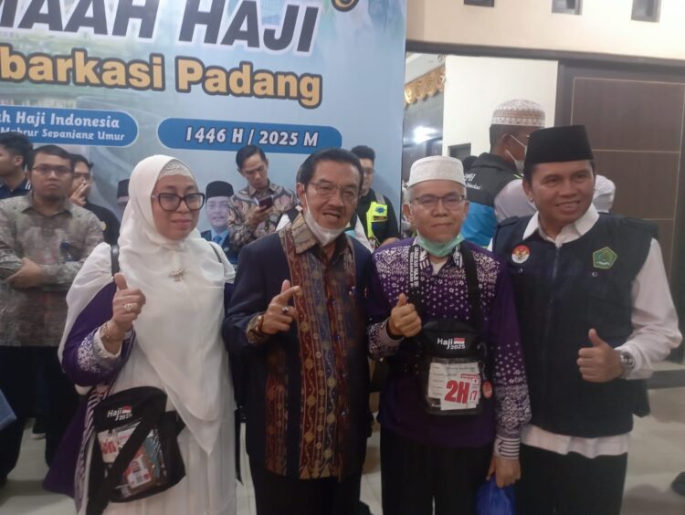 HARIANHALUAN. ID – Jamaah haji kelompok terbang (Kloter) 1 Debarkasi Padang kembali ke tanah air dengan selamat, Kamis malam (12/6/25).
