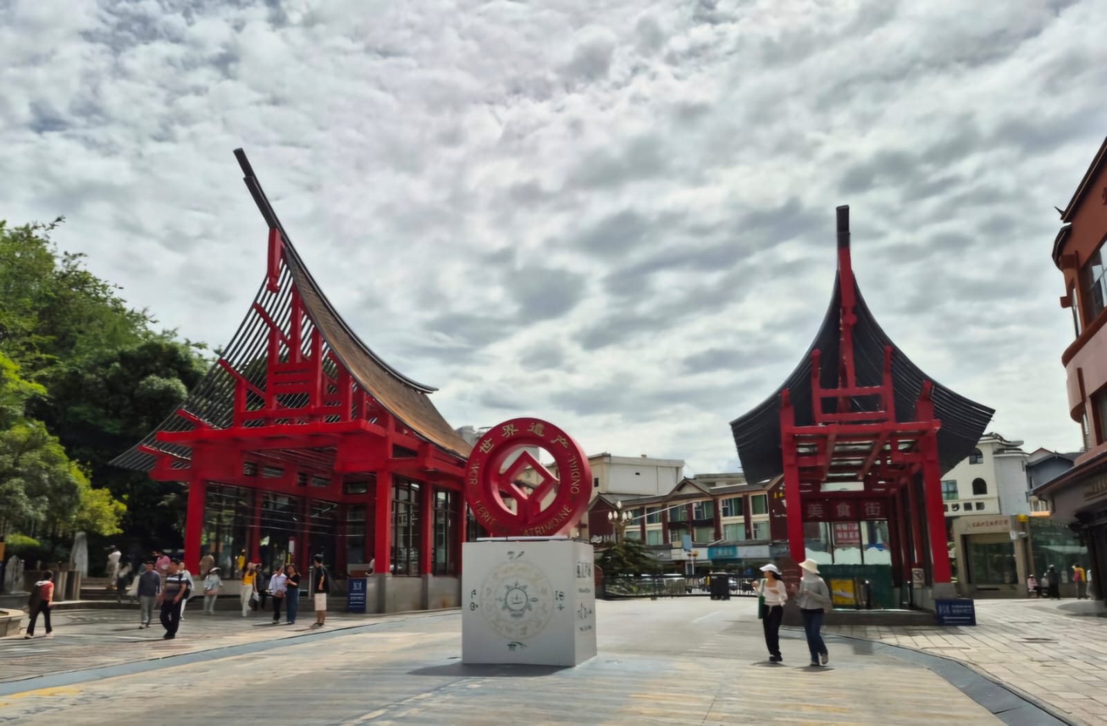 Pemandangan serupa juga telah kami saksikan dua hari sebelumnya, ketika kami tiba di Kota Tua Lijiang pada malam hari Jumat tanggal 20 Juni 2025. Namun karena malam hari, kami hanya sempat memotret gerbang kembar kota tua yang sedang bermandikan cahaya itu. Kami tidak sempat mengecek ulang di waktu siang, karena keesokan paginya kami sudah langsung berangkat ke Danau Lugu di Distrik Ninglang untuk mengunjungi Suku Mosuo. Kali ini, setelah kembali dari Mosuo, tujuan perjalanan kami setelah makan siang adalah untuk mengunjungi kawasan Kota Tua Lijiang di siang hari. Kami ingin mengkonfirmasi lagi penglihatan kami mengenai objek yang mirip rumah gadang kecil (rangkiang) dua malam sebelumnya.