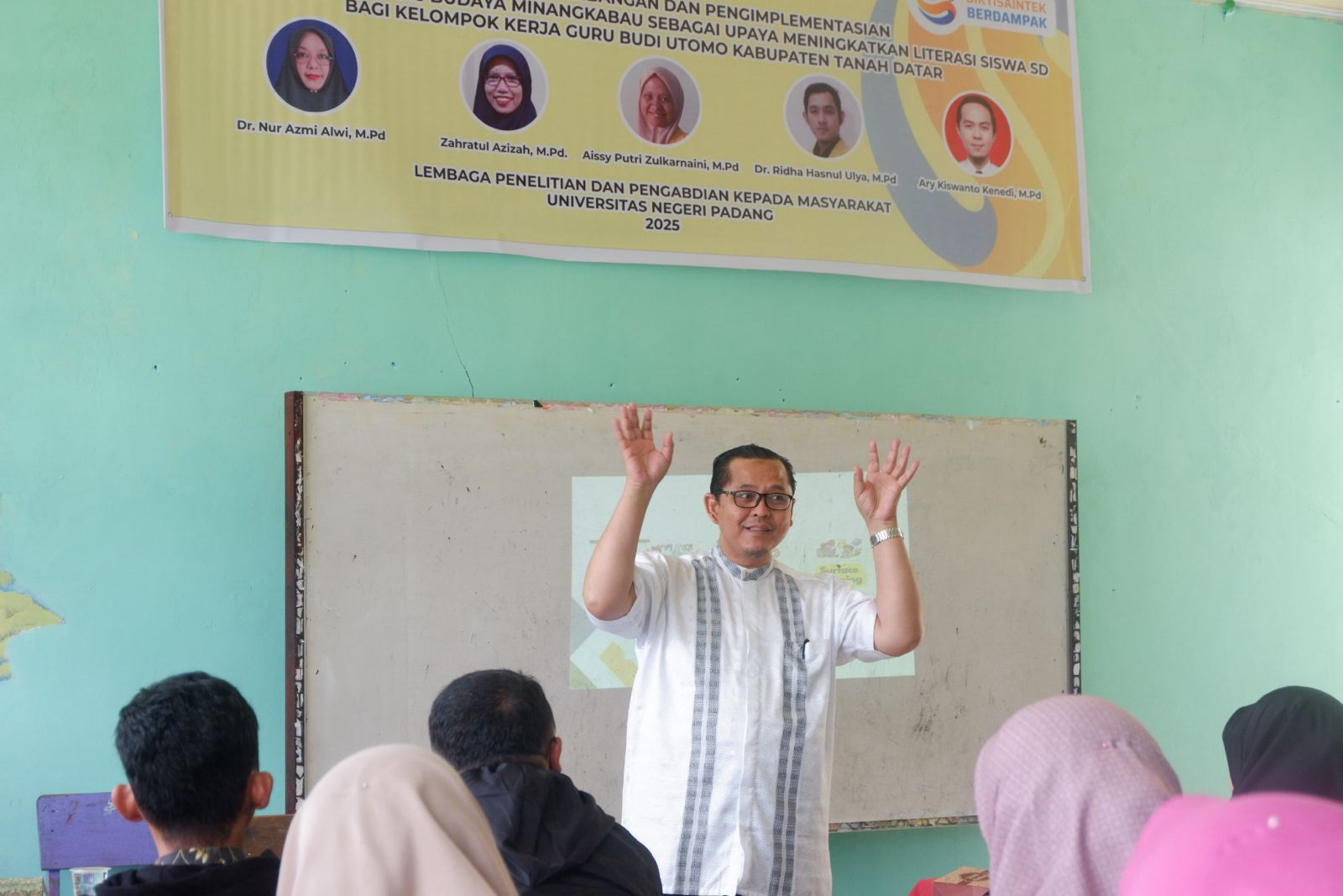 Dalam sambutannya, Ketua Pelaksana kegiatan, Dr. Nur Azmi Alwi, M.Pd., menekankan pentingnya menjadikan cerita rakyat Minangkabau sebagai bagian integral dalam strategi peningkatan literasi siswa.