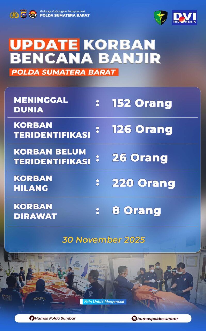 Kabid Humas Polda Sumbar, Kombes Pol Susmelawati Rosya, mengatakan bahwa hingga hari ini tercatat 152 korban meninggal dunia, dengan 126 di antaranya telah berhasil diidentifikasi oleh tim DVI. Sementara 26 korban lainnya masih dalam proses identifikasi.