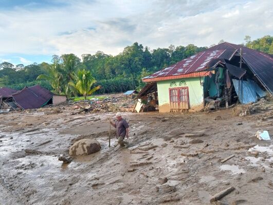 Di seberang sana, puluhan rumah tak lagi berdiri. Fondasinya terkupas, sebagian hanyut, sebagian lagi runtuh bersama aliran deras material yang datang dari hulu. Warga berdiri memandangi puing-puing tanpa kata, seperti masih tak percaya apa yang menimpa mereka.