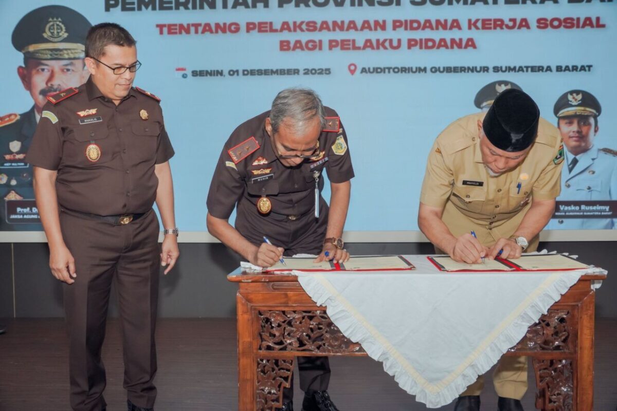 PADANG, HARIANHALUAN.ID – Kejaksaan Tinggi (Kejati) Sumatera Barat (Sumbar) bersama Pemerintah Provinsi Sumbar melaksanakan kegiatan penandatanganan perjanjian kerja sama terkait pelaksanaan pidana kerja sosial bagi pelaku tindak pidana, sebagai tindak lanjut dari berlakunya Undang-Undang Nomor 1 Tahun 2023 tentang Kitab Undang-Undang Hukum Pidana (KUHP), Senin (1/12/2025).