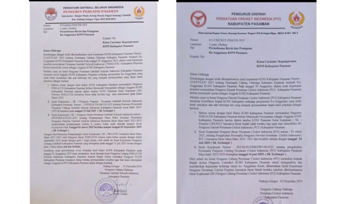 PASAMAN,HARIANHALUAN.ID — Dua organisasi cabang olahraga di Kabupaten Pasaman, yakni Persatuan Gateball Seluruh Indonesia (Pergatsi) dan Persatuan Cricket Indonesia (PCI), secara resmi mengajukan permohonan revisi dan penegasan status keanggotaan mereka kepada Komite Olahraga Nasional Indonesia (KONI) Kabupaten Pasaman. Permohonan tersebut disampaikan melalui dua surat terpisah yang masing-masing ditujukan kepada Ketua Caretaker KONI Pasaman pada 2 Desember 2025.