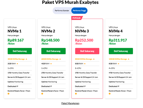 Dari sisi harga, VPS Exabytes tersedia mulai dari sekitar Rp89.167 per bulan, tergantung spesifikasi yang dipilih. Dengan kombinasi harga kompetitif dan performa andal, VPS Exabytes menjadi pilihan tepat bagi pemilik website yang ingin meningkatkan kualitas infrastrukturnya.