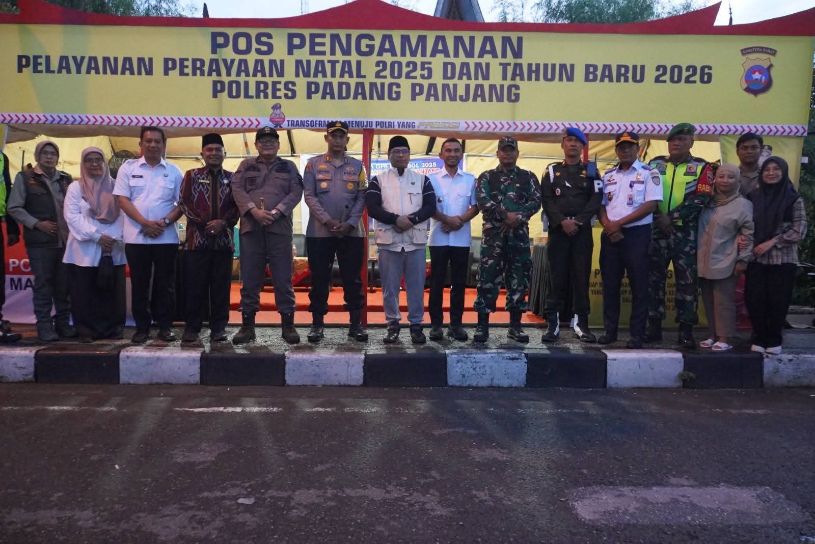 PADANG PANJANG, HARIANHALUAN.ID — Mendukung pelaksanaan Operasi Lilin Singgalang 2025, Pemerintah Kota Padang Panjang bersama Forum Koordinasi Pimpinan Daerah (Forkopimda) meninjau Pos Pelayanan Natal dan Tahun Baru (Nataru) yang berlokasi di depan Gedung M Sjafei, Rabu (25/12/2025).
