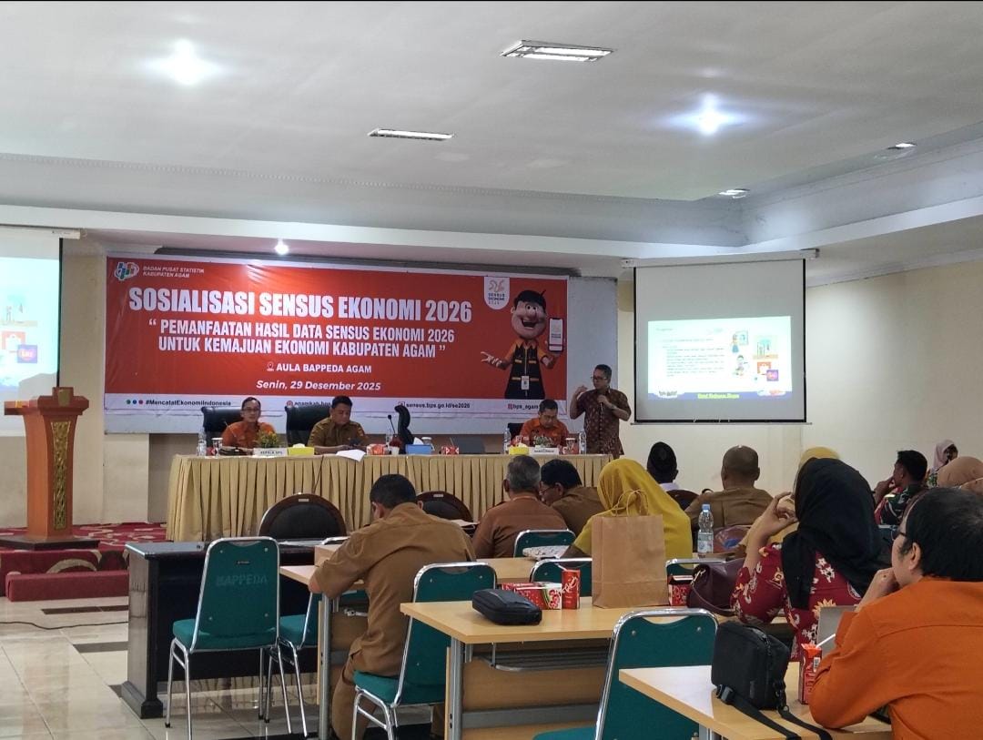 AGAM, HARIANHALUAN.ID — Badan Pusat Statistik (BPS) Kabupaten Agam menggelar Sosialisasi Sensus Ekonomi (SE) 2026 dengan tema Pemanfaatan Hasil Data Sensus Ekonomi 2026 untuk Kemajuan Ekonomi Kabupaten Agam di Aula Bappeda Agam, Senin (29/12).