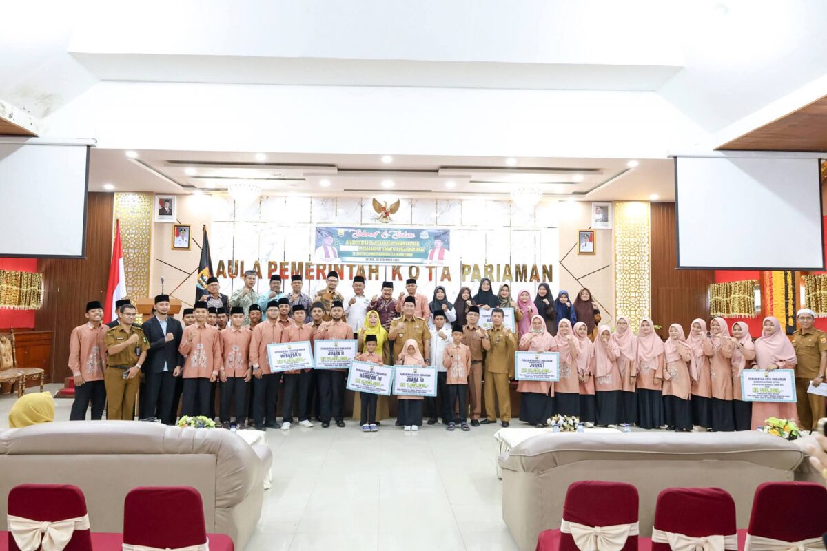 PARIAMAN, HARIANHALUAN.ID — Wali Kota Pariaman Yota Balad menyerahkan bonus untuk kafilah Musabaqah Tilawatil Qur’an (MTQ) Kota Pariaman yang telah berlaga pada MTQ ke-41 Tingkat Provinsi Sumatera Barat di Kota Bukittinggi beberapa minggu yang lalu, bertempat di Aula Balaikota Pariaman, Selasa (30/12/2025).