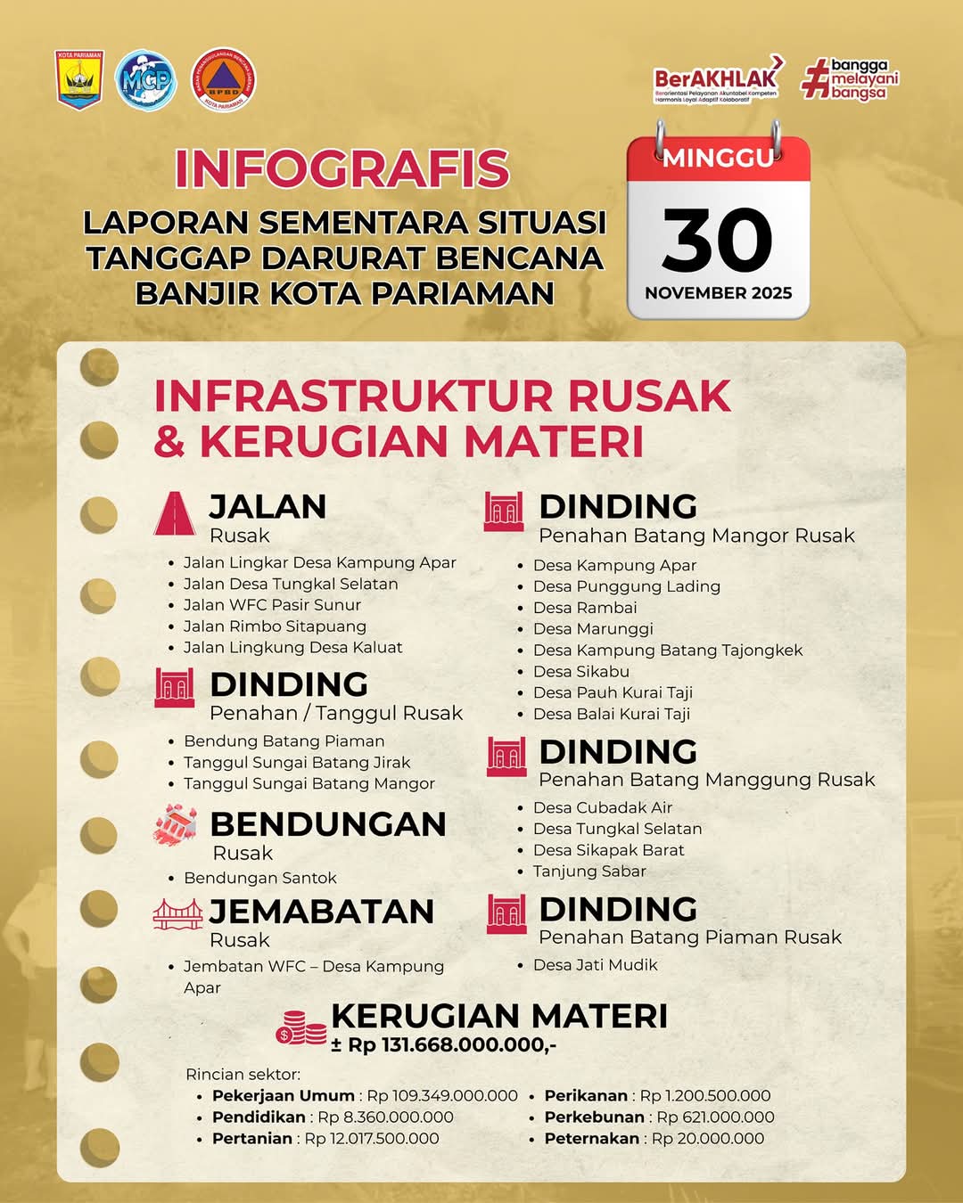 Estimasi kerugian sementara mencapai Rp131,6 miliar, meliputi sektor pekerjaan umum, pendidikan, pertanian, perikanan, perkebunan, dan peternakan. Angka ini berpotensi bertambah setelah verifikasi lapangan selesai.