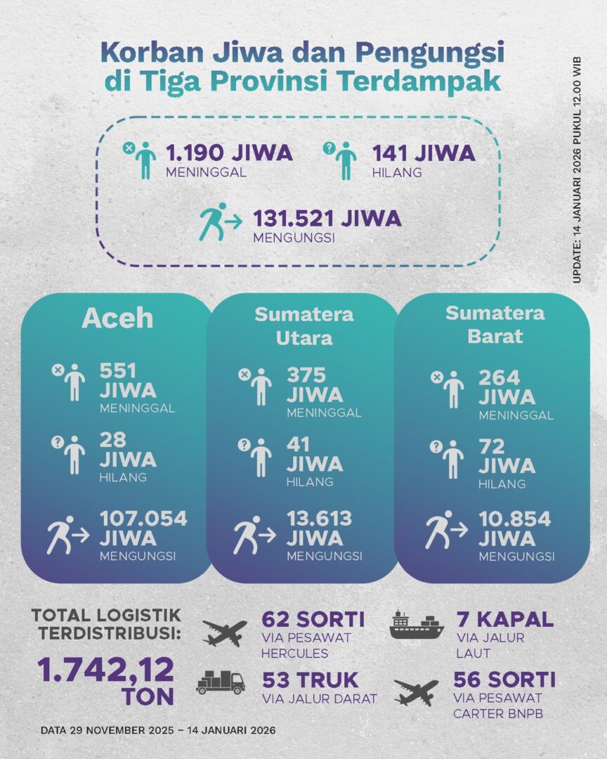 Di sisi logistik dan peralatan, distribusi bantuan terus digencarkan melalui jalur darat dan udara guna menjangkau seluruh wilayah terdampak. Sejak 29 November 2025 hingga 14 Januari 2026, total logistik yang dimobilisasi mencapai 1.742 ton. Sebanyak 99,2 persen dari total tersebut telah tersalurkan kepada masyarakat terdampak melalui koordinasi BNPB, BPBD, dan pemerintah daerah setempat.