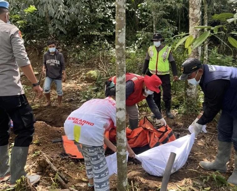 Jenazah korban dievakuasi oleh petugas dengan bantuan warga dan selanjutnya diserahkan kepada pihak keluarga.