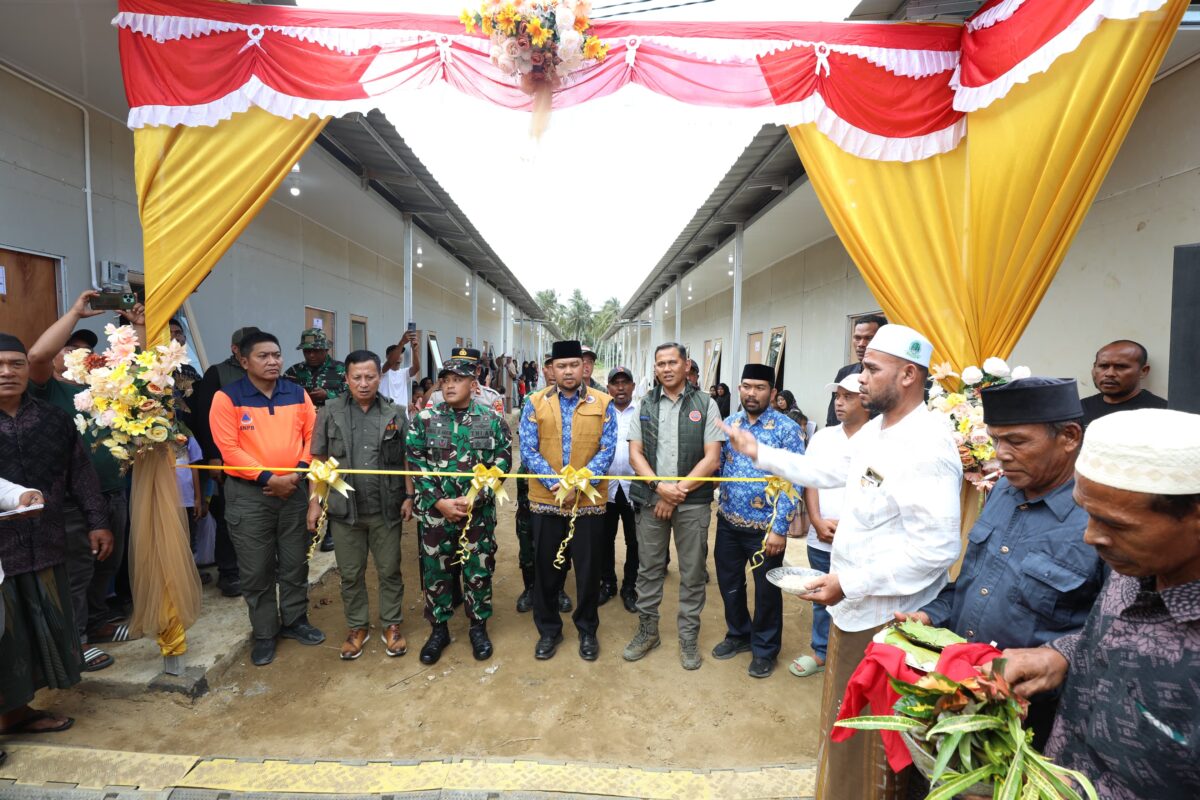ACEH UTARA, HARIANHALUAN.ID – Badan Nasional Penanggulangan Bencana (BNPB) meresmikan hunian sementara (huntara) di Gampong Ulee Rubek Timu, Kecamatan Seunuddon, Kabupaten Aceh Utara, Provinsi Aceh pada Kamis (5/2). Sebanyak 84 unit huntara kini sudah bisa ditempati untuk warga sekitar yang terdampak bencana.