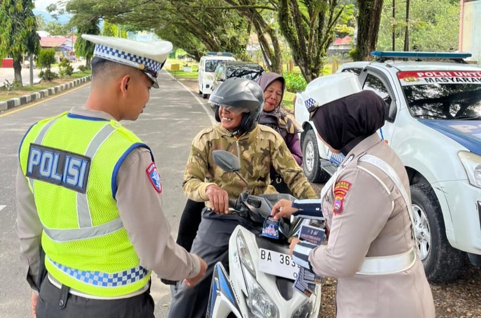 Pemeriksaan dilakukan terhadap pengendara dan kendaraan bermotor, meliputi kelengkapan surat-surat kendaraan serta kepatuhan terhadap aturan lalu lintas. Selain penindakan, petugas juga kembali membagikan brosur Ops Keselamatan Singgalang 2026 dan memberikan imbauan secara humanis kepada pengguna jalan.