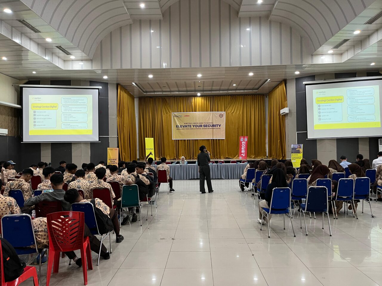 PADANG, HARIANHALUAN.ID – Ratusan siswa SMKN 2 Padang menghadiri kegiatan bertema “Norton & J-Bros Goes to School: Elevate Your Security” yang diselenggarakan oleh Norton, brand software keamanan global yang untuk wilayah Indonesia didistribusikan oleh PT Kharisma Inside Mandiri Sejahtera (KIMS), bekerja sama dengan J-Bros Computer Padang.
