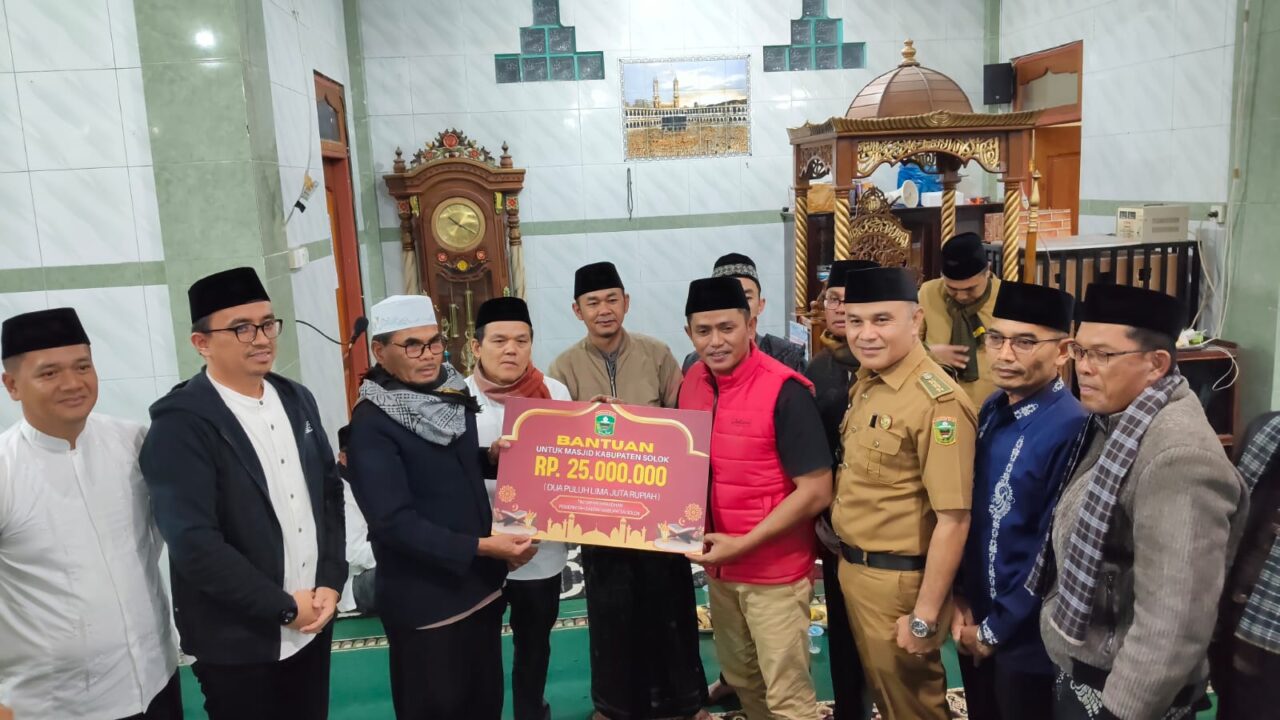 Kegiatan Safari Ramadan diawali tausyiah oleh Dr. Dendi dengan tema “Lima Penghalang Pahala Sedekah”, berlangsung khidmat dan ditutup dengan penyerahan bantuan hibah masjid Rp25 juta dari Pemkab Solok serta bantuan Rp2 juta dari Bank Nagari. (*)