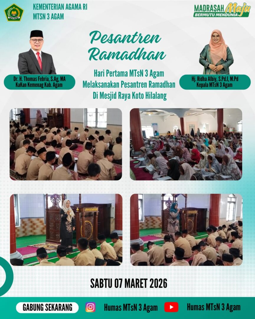 HARIANHALUAN. ID – Setelah 11 hari melaksanakan kegiatan Proses Belajar Mengajar (PBM) baik secara daring maupun luring selama bulan Ramadhan, Madrasah Tsanawiyah Negeri (MTsN) 3 Agam mengawali kegiatan Pesantren Ramadhan, Sabtu, 7 Maret 2026. Kegiatan ini diikuti seluruh siswa kelas VII, VIII, dan IX dengan rangkaian kegiatan yang sarat nilai ibadah serta pembinaan karakter. Kegiatan diawali dengan pelaksanaan shalat duha. Setelah itu, para siswa melaksanakan zikir dan fo’a dipimpin Zaki dari kelas VII.6. Suasana religius semakin terasa ketika kegiatan dilanjutkan dengan Muraja’ah Surah Al Mutaffifin dipimpin Fitri dari kelas VII.6. Selanjutnya, siswa melaksanakan tadarus Al Qur’an bersama. Kegiatan Pesantren Ramadhan kemudian dilanjutkan dengan tausiyah Ramadhan disampaikan Widia yang memberikan motivasi kepada siswa untuk memperkuat keimanan selama bulan Ramadhan. Kepala MTsN 3 Agam, Ibu Hj. Ridha Albiy, SPdI, MPd memberikan arahan kepada siswa agar mengikuti kegiatan Pesantren Ramadhan dengan sungguh-sungguh serta menjadikannya sebagai sarana memperdalam pemahaman agama. Menjelang waktu zuhur, siswa mengikuti kegiatan tahsin Al Qur’an dibimbing wali kelas dan guru pendamping. Kegiatan ini bertujuan untuk memperbaiki bacaan Al Qur’an siswa agar lebih tartil dan sesuai dengan kaidah tajwid. Setelah kegiatan tahsin selesai, seluruh siswa melaksanakan shalat zuhur berjamaah. Usai shalat, siswa kelas VII dan VIII dipulangkan. Sementara itu, siswa kelas IX masih melanjutkan rangkaian Pesantren Ramadhan dengan mengikuti kajian keagamaan disampaikan Elfina Rita. Kegiatan untuk siswa kelas IX ditutup dengan pelaksanaan shalat ashar berjamaah sebelum akhirnya mereka dipulangkan. Hari pertama Pesantren Ramadhan di MTsN 3 Agam berlangsung dengan lancar, tertib, dan penuh antusiasme dari para siswa. Kegiatan ini diharapkan dapat menumbuhkan kecintaan siswa terhadap Al Qur’an serta meningkatkan kualitas ibadah selama bulan suci Ramadhan (Humas).