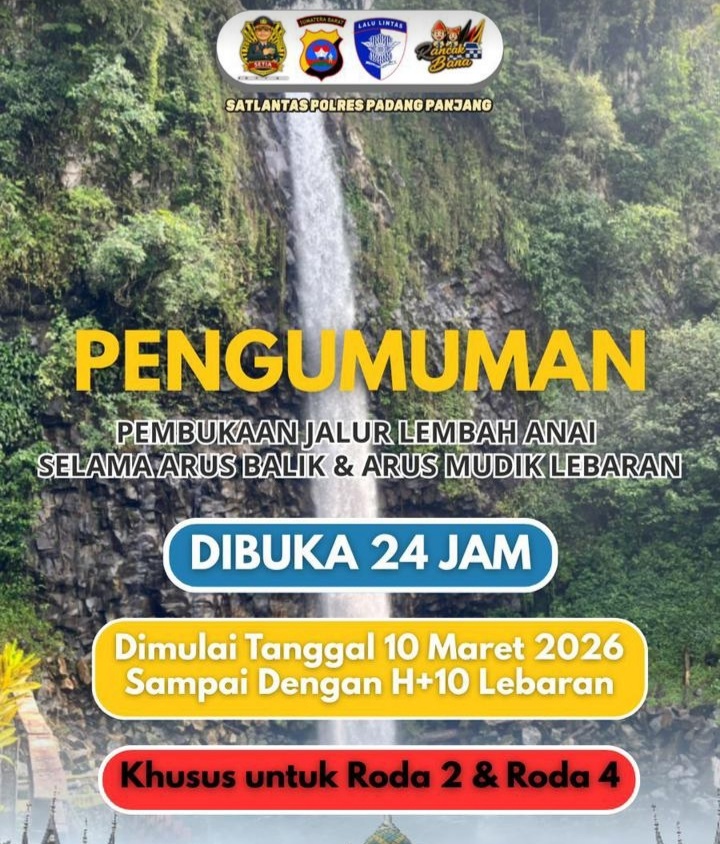 Mulai hari ini, Selasa (10/3), jalur utama Lembah Anai pada ruas Sicincin-Padang Panjang dipastikan akan dibuka selama 24 jam nonstop untuk kendaraan roda dua dan roda empat selama masa arus mudik dan balik Lebaran 2026.