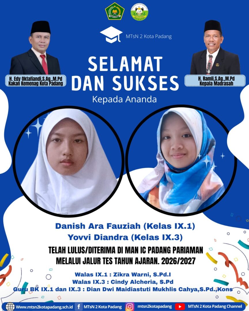 Dengan capaian tersebut, keluarga besar MTsN 2 Padang berharap kedua murid yang lulus dapat terus mengukir prestasi di jenjang pendidikan berikutnya dan menjadi generasi yang berilmu, berakhlak mulia, serta mampu memberikan kontribusi positif bagi masyarakat dan bangsa. (humas)