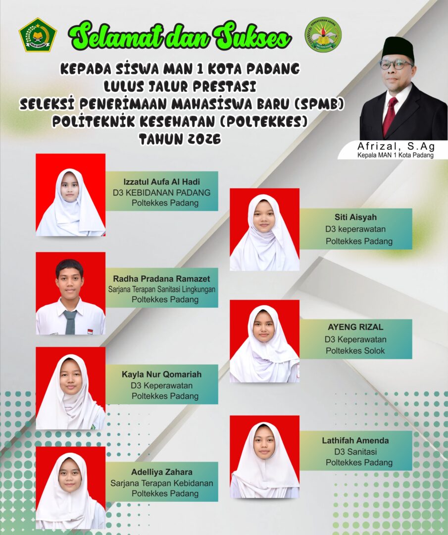 HARIANHALUAN. ID – Sebanyak tujuh orang siswa Madrasah Aliyah Negeri (MAN) 1 Padang lulus pada Seleksi Nasional Berbasis Prestasi (SNBP) pada Politeknik Kesehatan (poltekes) Kementerian Kesehatan RI.