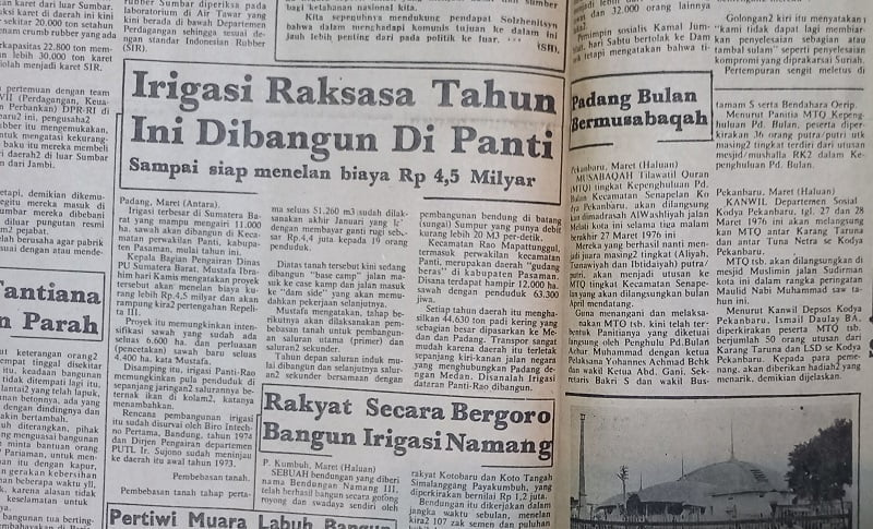 BERITA INI DITERBITKAN KORAN UMUM HALUAN PADA EDISI SENIN 29 MARET 1976 DENGAN JUDUL “IRIGASI RAKSASA TAHUN INI DIBANGUN DI PANTI”. KEMUDIAN DITULIS ULANG DENGAN NARASI YANG SAMA OLEH PENULIS PEMULA BERBAKAT, AMANDA ALTHAFUNNISA R (SISWI SMPN 8 PADANG).