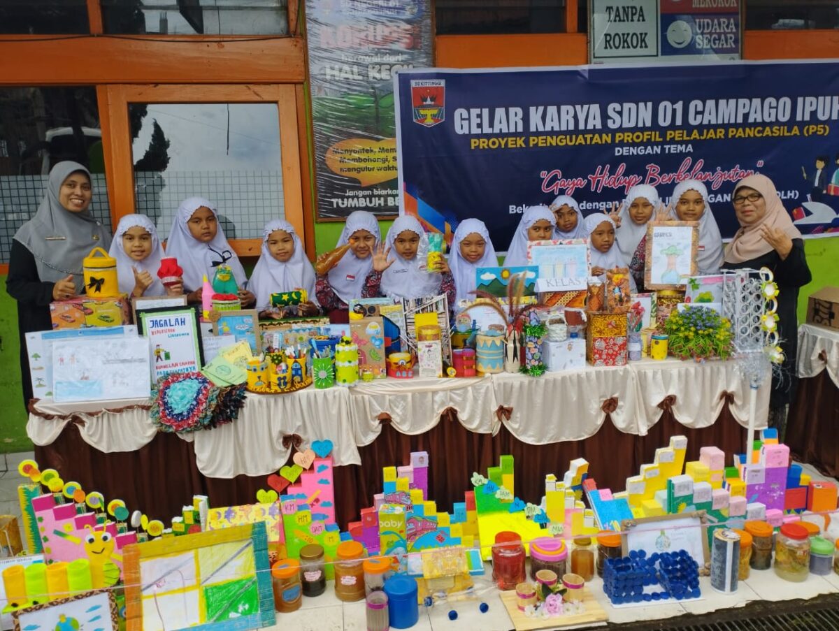 Karya seperti vas bunga, bingkai foto, lampu tidur, meja dan kursi dari barang bekas, merupakan hasil keterampilan siswa SDN 01 Campago Ipuh implementasi Proyek Penguatan Profil Pelajar Pancasila (P5) dengan tema “Gaya Hidup Berkelanjutan”.