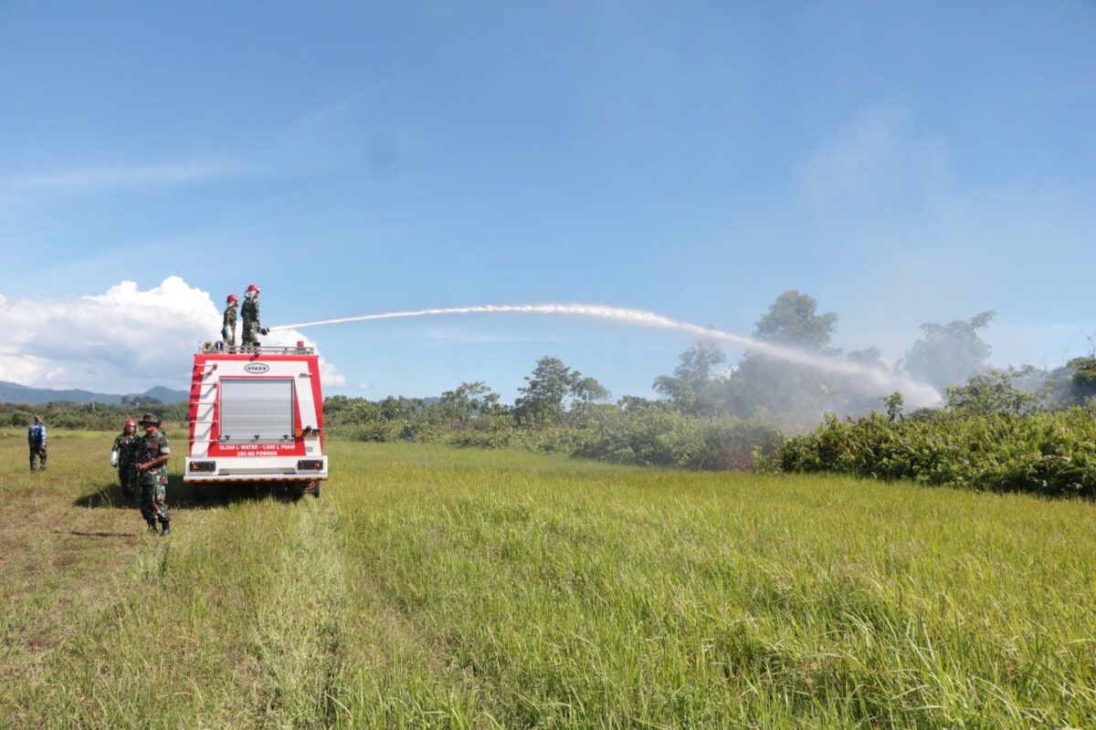 PADANG, HARIANHALUAN.ID — Pemadam Kebakaran (PK) Base Ops Disops Lanud Sut melaksanakan latihan Simulasi penanggulangan kebakaran Lahan yang diikuti seluruh personel PK. Simulasi tersebut dilaksanakan di ujung runway 34, Lanud Sutan Sjahrir, Padang, Jumat (31/3).
