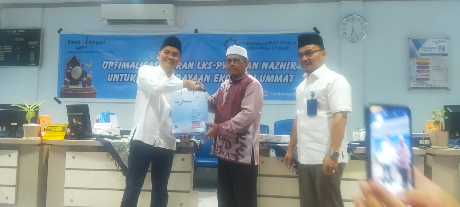 “Dengan telah diberikannya izin kepada Unit Usaha Syariah Bank Nagari sebagai Lembaga Keuangan Syariah Penerima Wakaf Uang (LKS-PWU), tentunya ini memberikan semangat baru bagi masyarakat Sumbar untuk menempatkan Wakaf Uang kepada Nazhir melalui Bank Nagari yang memiliki Layanan Syariah yang tersebar diseluruh Sumatera Barat. Tentunya ini menjadi Langkah Optimalisasi pengembangan ekonomi ummat berbasis keuangan sosial syariah khususnya wakaf. Kami di BPW Ar Risalah telah menjalin kerja sama dengan Bank Nagari, sehingga jika ada ummat yang mau memberikan wakafnya melalui BPW Ar Risalah bisa langsung berkunjung ke Bank Nagari terdekat dan setiap Wakaf Uang yang nominalnya diatas Rp1 juta akan langsung diberikan Sertifikat Wakaf Uang (SWU). Harta wakaf dapat membantu aktivitas ekonomi sebuah negara, baik digunakan sebagai sumber modal pembangunan atau yang lain. Dan melalui LKS PWU, Wakaf bisa menjadi salah satu instrument ekonomi islam yang bisa membantu penyelesaian masalah ekonomi ummat karena dikelola secara professional dan produktif,” paparnya.