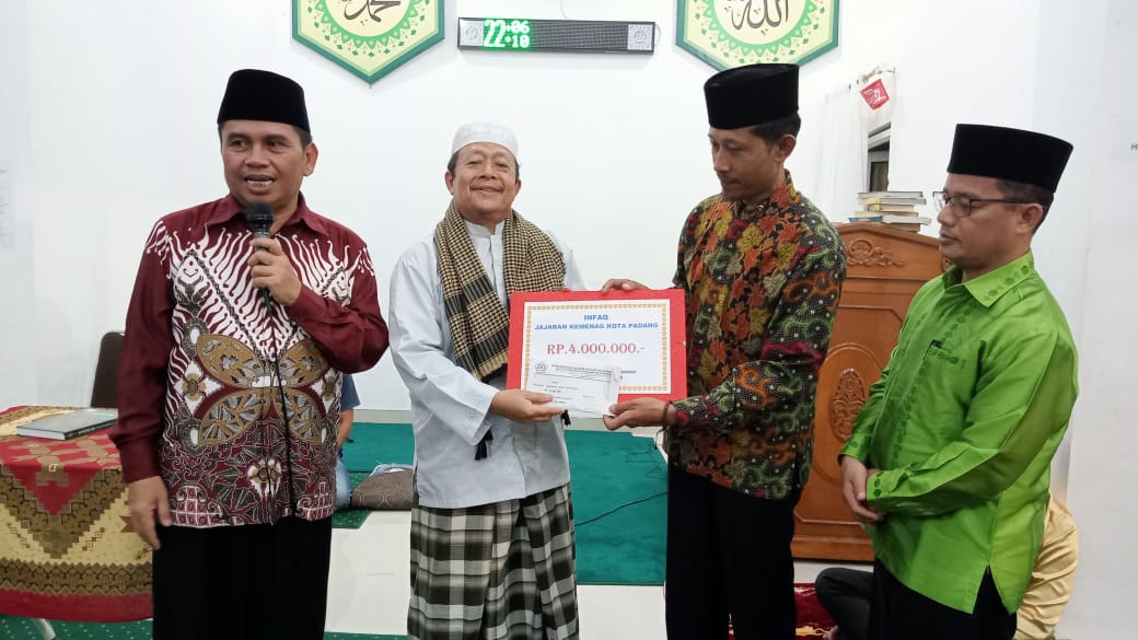TSR Kankemenag Padang menyerahkan bantuan Al Quran dan uang tunai sebesar Rp 4 juta diterima pengurus mushala H. Saidan Lubis. Bantuan tersebut wakaf, infak, sedekah dari keluarga besar Kankemenag Padang dan mitra kerja Kankemenag Padang.