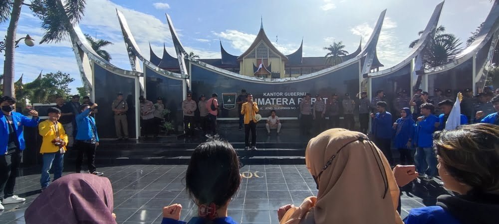 PADANG, HARIANHALUAN.ID – Puluhan mahasiswa yang tergabung dalam Aliansi Badan Eksekutif Mahasiswa se-Sumatera Barat (BEM-SB) menggelar aksi unjuk rasa peringatan hari buruh di depan kantor Gubernur Sumbar Selasa (9/5) siang. Dalam orasinya, massa aksi kembali menyuarakan penolakan terhadap Undang-Undang (UU) Cipta Kerja (Ciptaker) yang disinyalir hanya pro kepentingan investor serta mengandung sejumlah pasal yang berpotensi akan semakin menyengsarakan kalangan buruh dan pekerja.