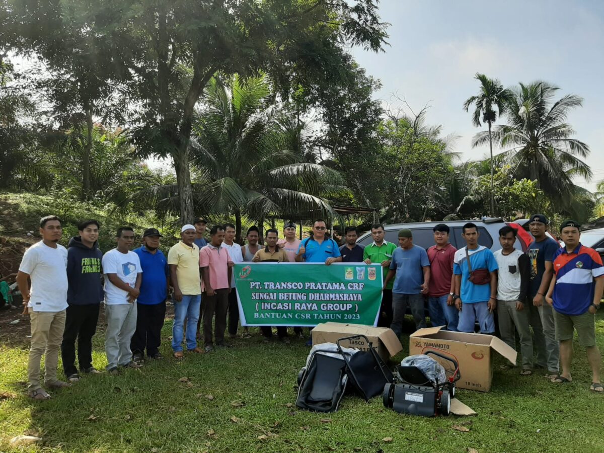 Staf CSR Incasi Raya Group Parlin Romansyah didampingi Wakil Manajemen Frengky Satria menyerahkan mesin potong rumput untuk LILUPER FC.maryadi
