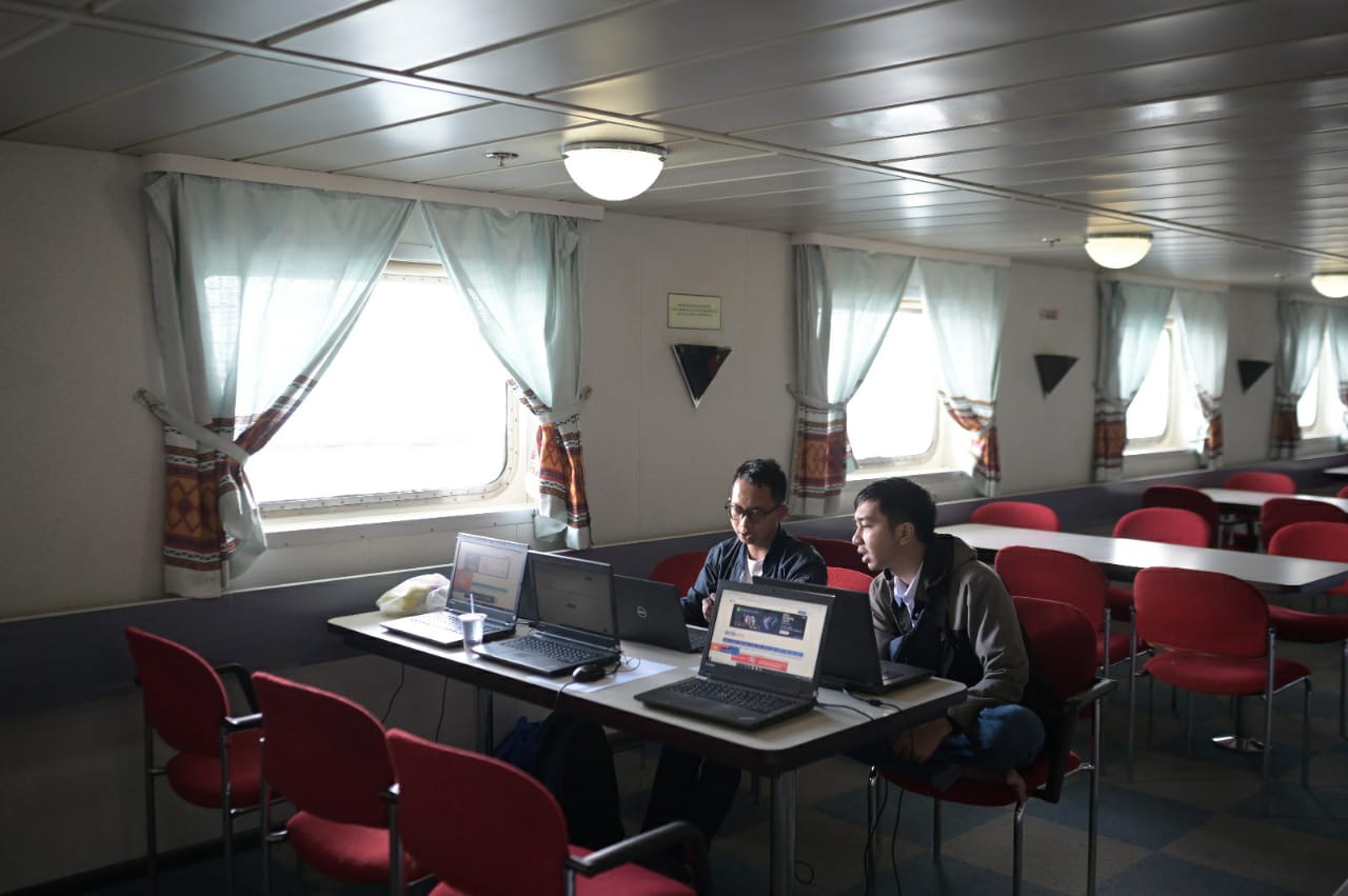 Awak media mengakses jaringan telekomunikasi dan layanan yang disediakan oleh TelkomGroup di KM Sinabung milik PT Pelni yang digunakan sebagai akomodasi terapung dalam mendukung KTT ke-42 ASEAN berlokasi di Labuan Bajo, Rabu (10/5). Telkom berkomitmen untuk mendukung suksesnya gelaran KTT tersebut melalui penyediaan infrastruktur telekomunikasi dan layanan TelkomGroup yang berkualitas. IST
