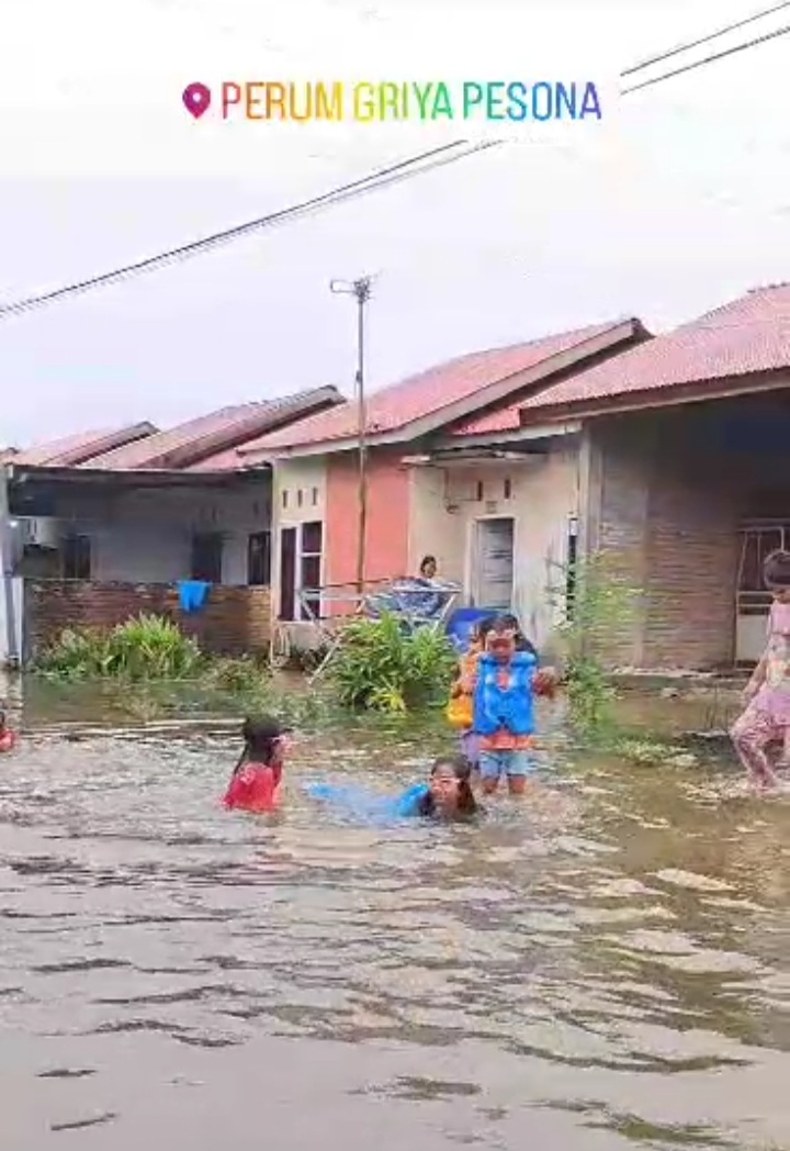 Di Komplek Griya Pesona, kawasan By Pass lebih seru lagi. Luapan air banjir yang menggenangi komplek perumahan itu, justru dijadikan kolam renang yang luas bagi mereka.