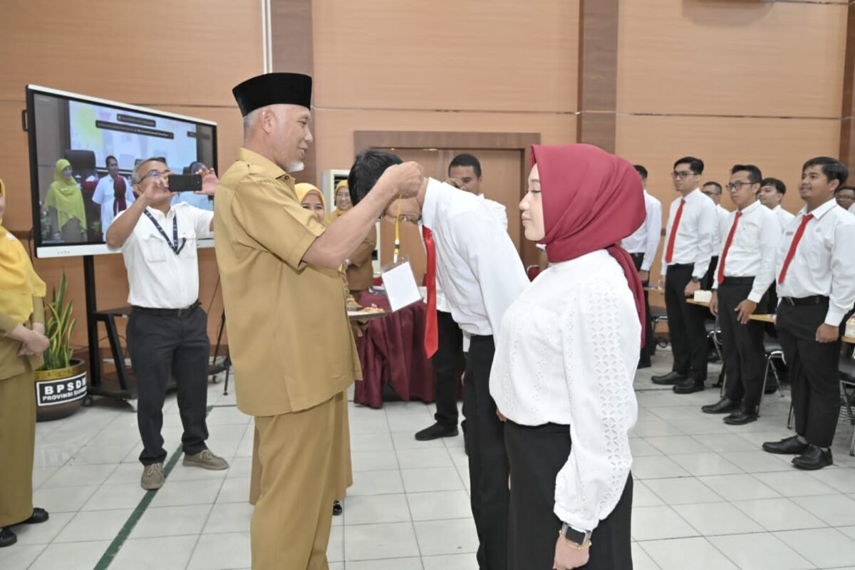 Gubernur Sumatera Barat, Mahyeldi Ansharullah mengalungkan kokarde kepada perwakilan peserta Pelatihan GTA Sumatera Barat Tahun 2023 yang diselenggarakan di Aula BPSDM Sumbar, Senin (31/7). IST