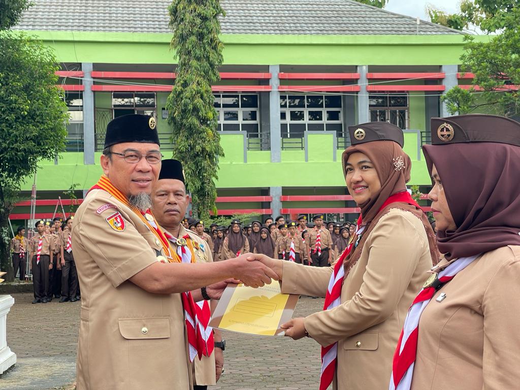 Wakil Ketua Kwarda Pramuka Sumbar Maigus Nasir didampingi Kepala SMAKPA Nasir menyerahkan tanda penghargaan kepada pembina gudep sekolah tersebut, Senin (14/8/23). IST