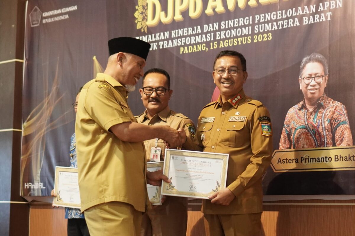 Penghargaan ini diterima langsung oleh Bupati Solok Selatan, Khairunas dari Direktorat Jenderal Perbendaharaan (DJPb) Wilayah Sumatra Barat di Padang, Selasa (15/8/2023).