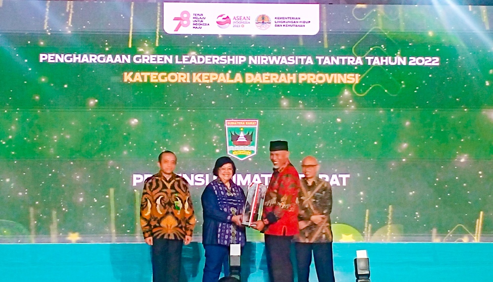 PADANG, HARIANHALUAN.ID — Sumatera Barat (Sumbar) berhasil meraih Penghargaan Green Leadership Nirwasita Tantra Tahun 2022 dari Kementerian Lingkungan Hidup dan Kehutanan (KLHK) RI untuk tiga kategori, yang masing-masing diberikan kepada Gubernur Sumbar, Pemerintah Provinsi Sumatera Barat (Pemprov Sumbar), dan Pimpinan DPRD Sumbar.