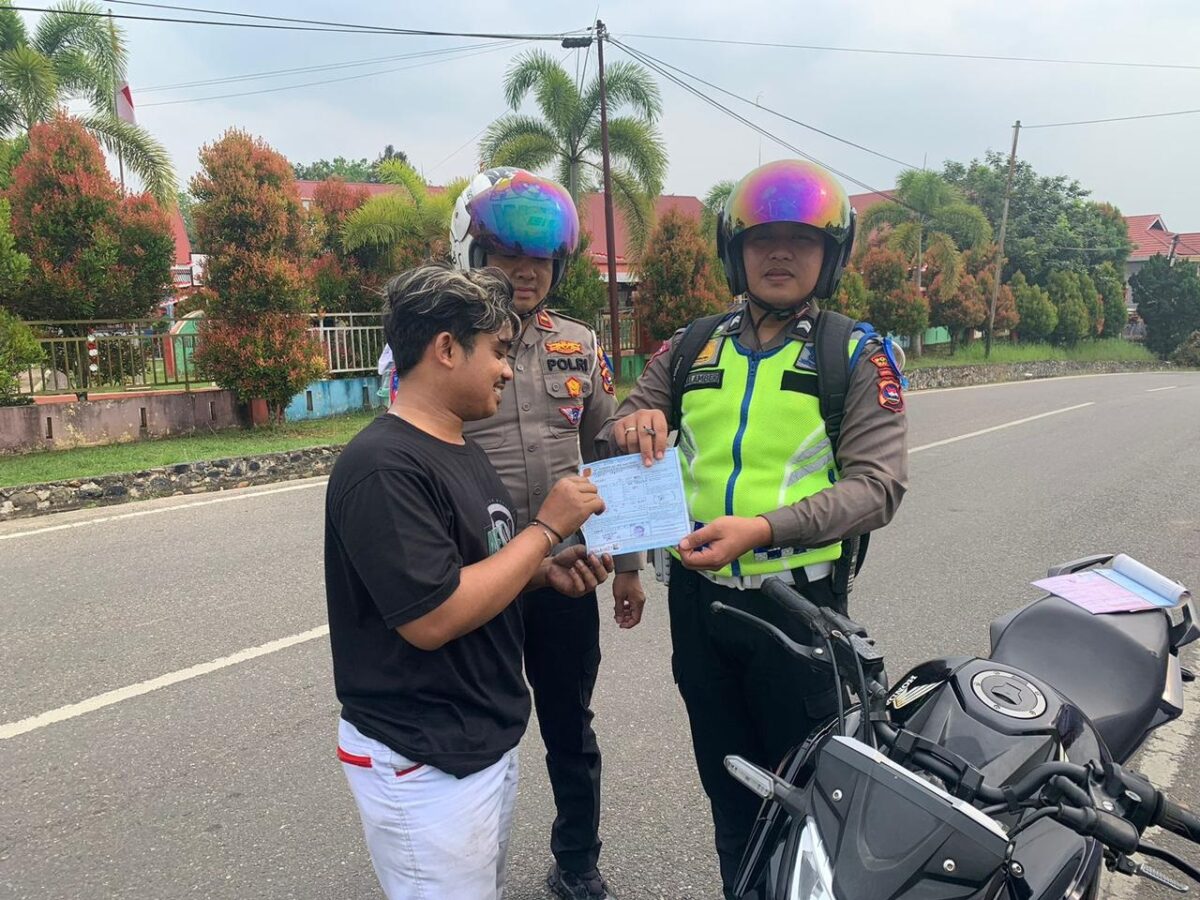 Petugas Satlantas Polres Sijunjung saat melakukan tindakan penilangan terhadap pengguna kendaraan roda dua yang melanggar peraturan lalu lintas di jalan raya, Rabu (6/9). IST