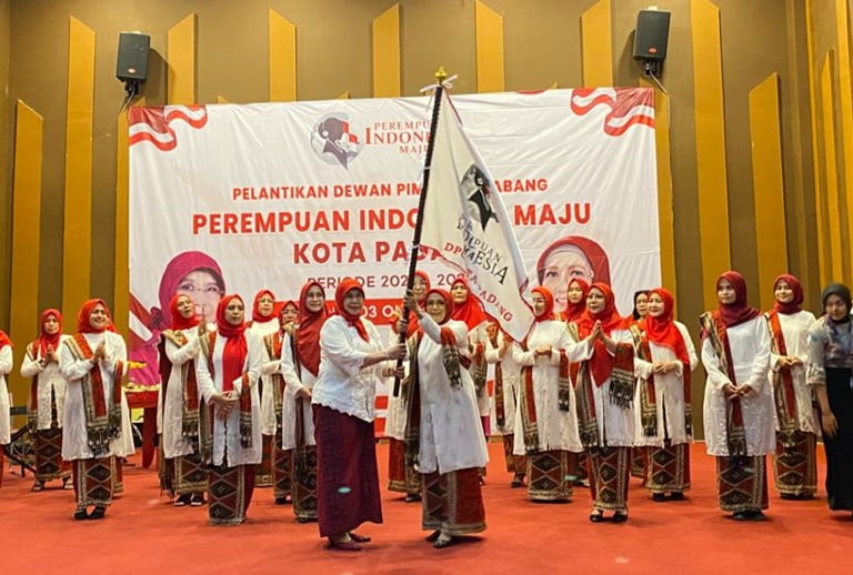 Ketua Dewan Pimpinan Cabang (DPC) Kota Padang, Perempuan Indonesia Maju (PIM) Irawati Meuraksa menerima pataka dari Ketua Dewan Pimpinan Daerah (DPD) Perempuan Indonesia Maju (PIM) Sumatera Barat (Sumbar) Hj. Emma Yohana di Gedung Youth Center, Jalan Bagindo Aziz Chan No. 2 Padang, Selasa (3/10). IST
