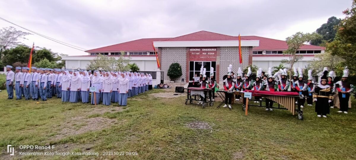 HARAIANHALUAN.ID – Paduan suara siswa kelas Takhassus dan Marching Band Symphoni Mantigo Community Madrasah Aliyah Negeri (MAN) 3 Padang tampil memeriahkan peringatan Hari Santri Nasional ke-8 tingkat Kota Padang di Pondok Pesantren (Ponpes) Sabbihisma Padang Minggu (22/10/23).