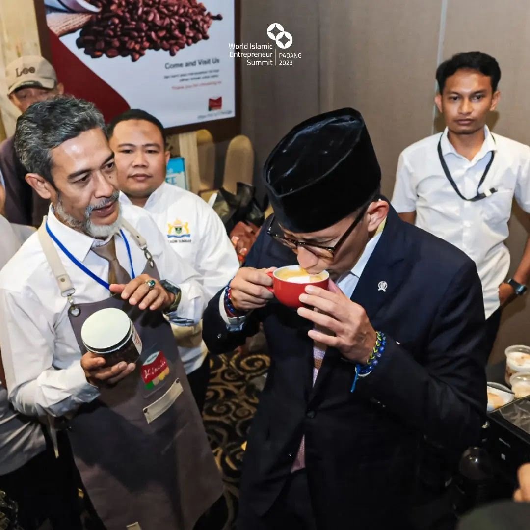 Menparekraf Sandiaga Uno saat menyuguh kopi di salah satu gerai UMKM dalam ajang WEIS 2023. IST