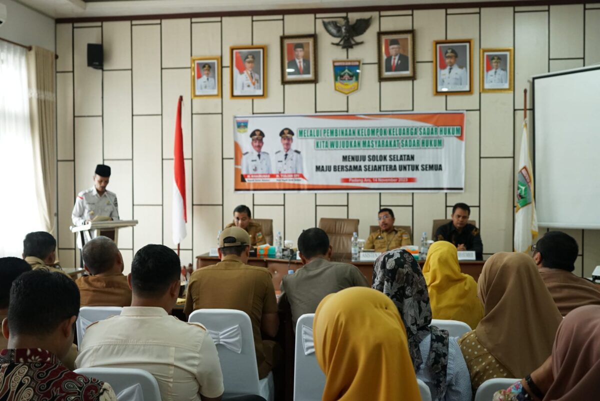 SOLSEL, HARIANHALUAN.ID — Pemerintah Kabupaten (Pemkab)Solok Selatan (Solsel) melalui Bagian Hukum Sekretariat Daerah Kabupaten (Setdakab) menggelar Sosialisasi Sadar Hukum bagi Kelompok Keluarga Sadar Hukum (Kadarkum) yang diikuti langsung oleh Kelompok Kadarkum perwakilan kecamatan di Aula Tansi Ampek Kantor Bupati Solsel, Selasa, (14/11).