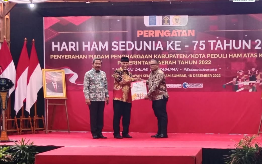 PADANG, HARIANHALUAN.ID Pemerintah Kabupaten (Pemkab) Solok Selatan (Solsel) menerima predikat sebagai Kabupaten/Kota Peduli Hak Asasi Manusia (HAM) dari Direktorat Jenderal Hak Asasi Manusia Kementerian Hukum dan HAM (Kemenkumham).