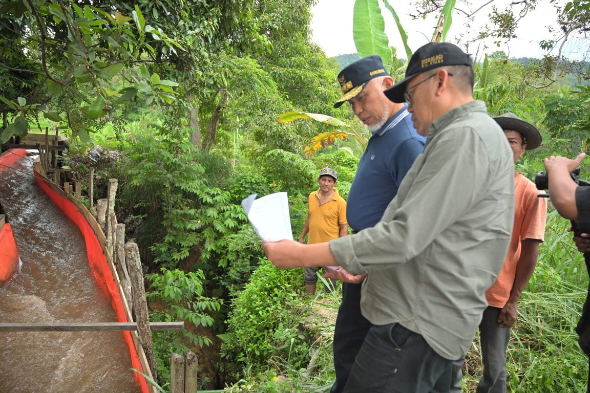 Gubernur Sumbar, Mahyeldi Ansharullah didampingi kepala OPD terkait jaringan irigasi yang rusak di Nagari Jawi-Jawi, Kabupaten Solok, Sabtu (13/1). IST