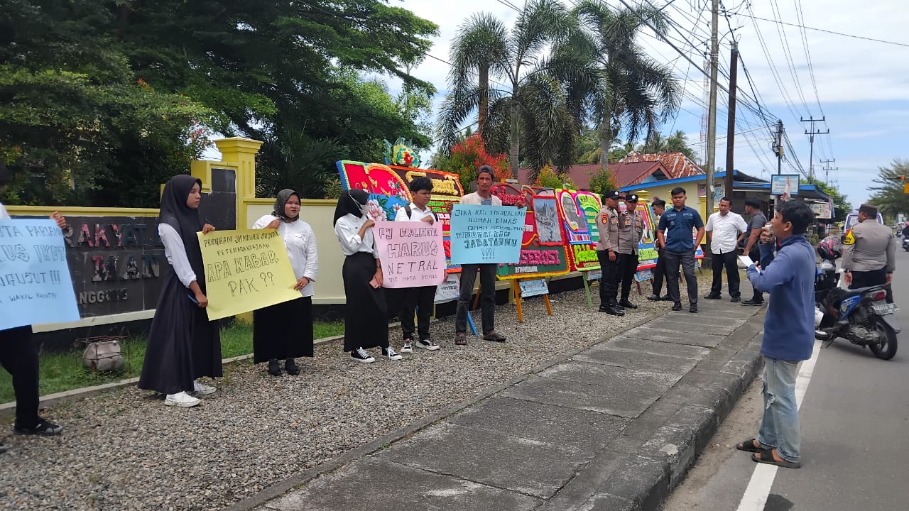 PARIAMAN, HARIANHALUAN.ID – Sejumlah mahasiswa yang tergabung ke dalam Lingkaran Mahasiswa Piaman Raya (Limapia) menggelar demonstrasi di depan gedung DPRD Kota Pariaman, Senin (22/1/2024).