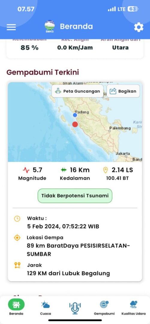 “#Gempa (UPDATE) Mag:5.7, 05-Feb-24 07:52:22 WIB, Lok:2.14 LS, 100.41 BT (Pusat gempa berada di laut 89 km BaratDaya Pesisir Selatan), Kedlmn:16 Km,” tulis akun X @infoBMKG.