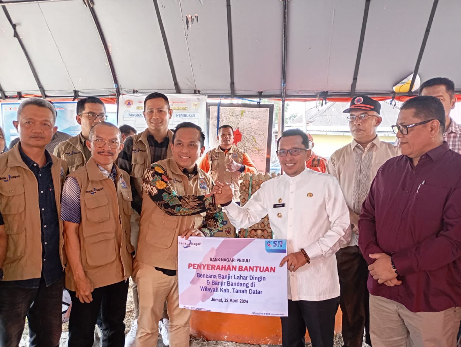 TANAH DATAR, HARIANHALUAN.ID – Bantuan yang diserahkan langsung Pjs Direktur Utama Bank Nagari Gusti Candra kepada Bupati Tanah Datar Eka Putra bertempat di Poko Utama bencana BPBD Tanah Datar itu turut dihadiri Direksi, Komisaris Bank Nagari beserta pejabat utama pemkab Tanah Datar.