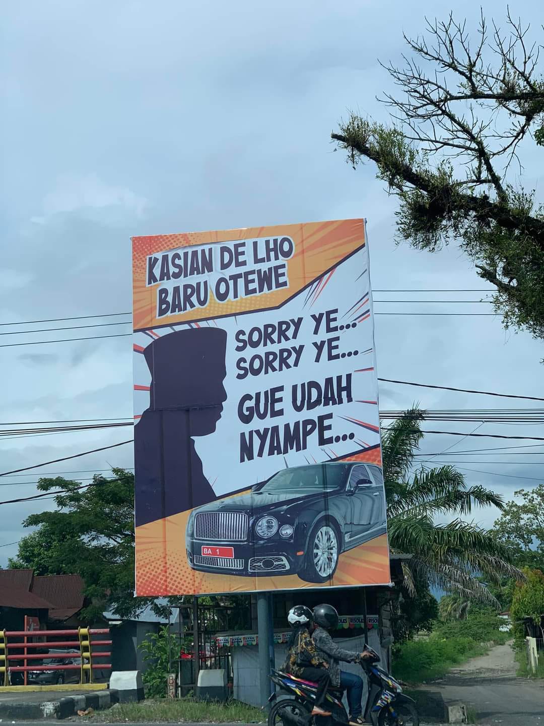 Di bawahnya terdapat tulisan “Sorry Ye, Sorry Ye, Gue Udah Nyampe” dengan gambar mobil mewah berplat nomor BA 1, plat resmi Gubernur Sumbar. (*)