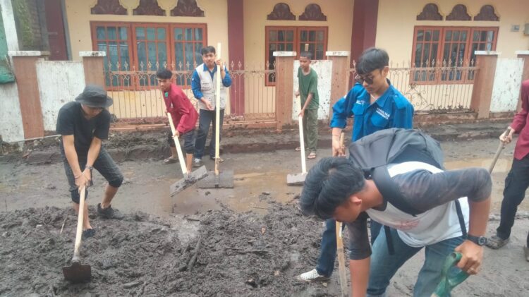 Teks Foto. Terlihat para mahasiswa UM. Sumbar sedang melaksanakan bersih bersih di daerah bencana banjir lahar dingin di Bukit Batabuah, Rabu (15/5). IST.
