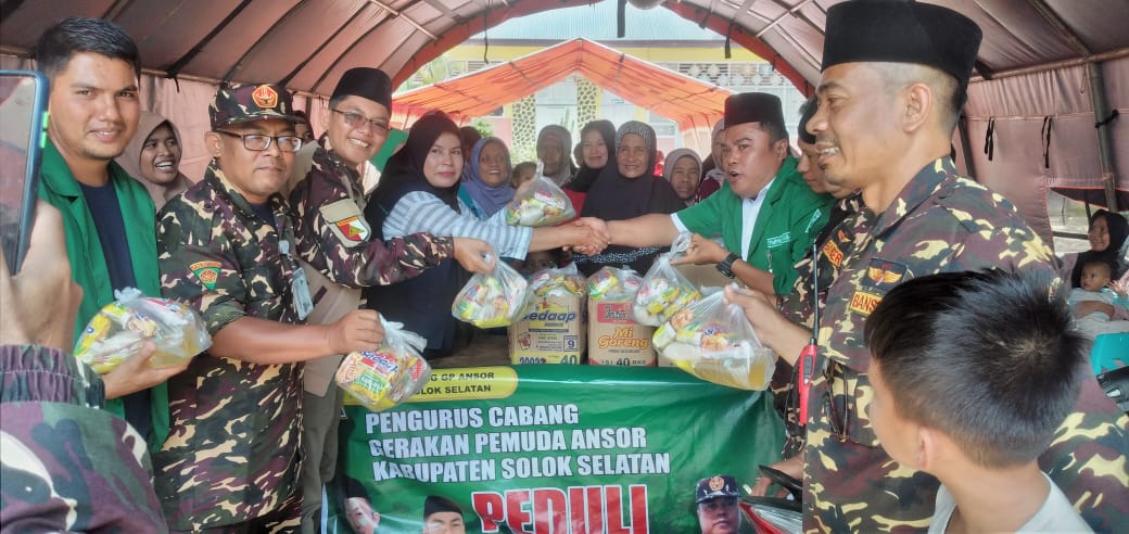 Kasat Korcab Banser Solok Selatan Dasril Yanto selaku pimpinan aksi peduli bencana tersebut menyampaikan kader Ansor Banser Solok Selatan terketuk untuk bergerak memberikan bantuan. bantuan yang diserahkan berupa kebutuhan pokok